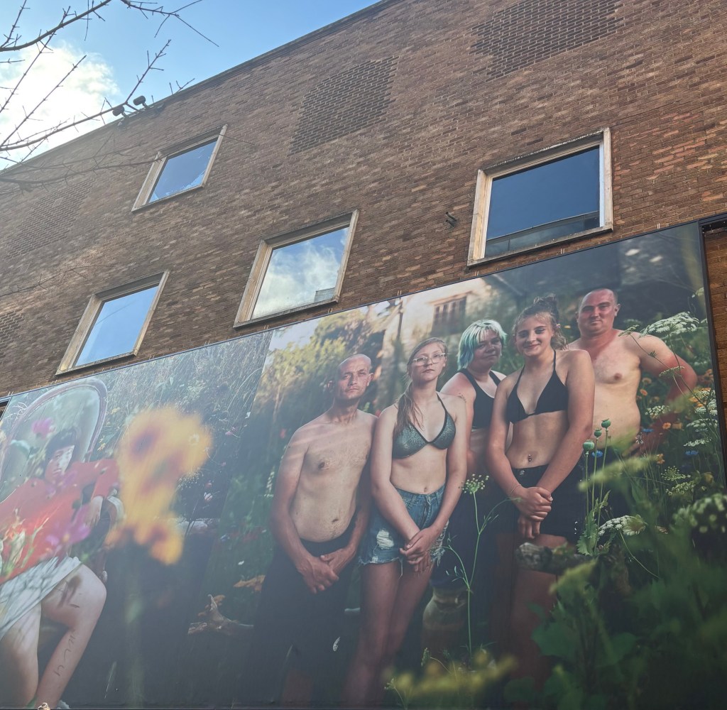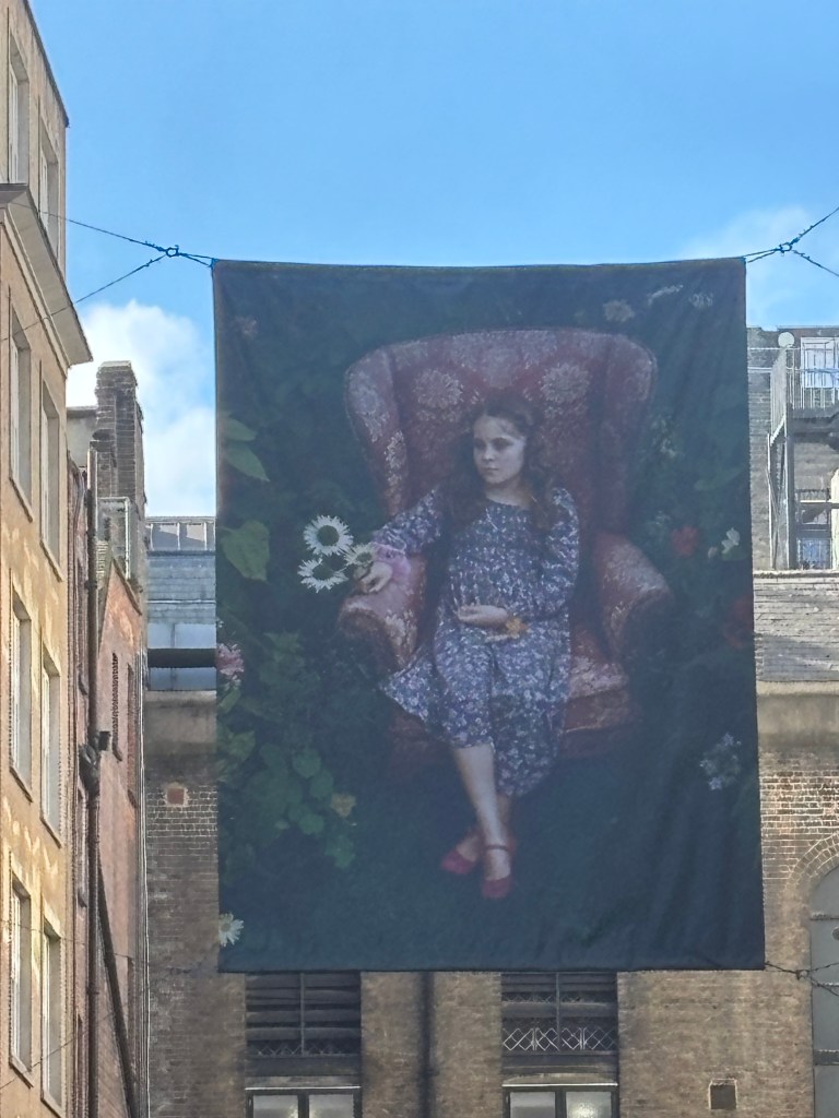 In this large-scale photo between two large buildings, a young girl sits in a red antique chair holding white sunflowers surrounded by a garden. The girl’s intense focus draws you in, making you feel engaged and attentive. The contrast between the vibrant colors of the dress and the red armchair against the more muted tones is striking. The red chair and her red shoes stood out to me the most, creating an interesting composition, with the banner perfectly framed between the two buildings, giving it a balanced and centered look. The image elicits ideas of purity and meditation, with a feeling of longing.