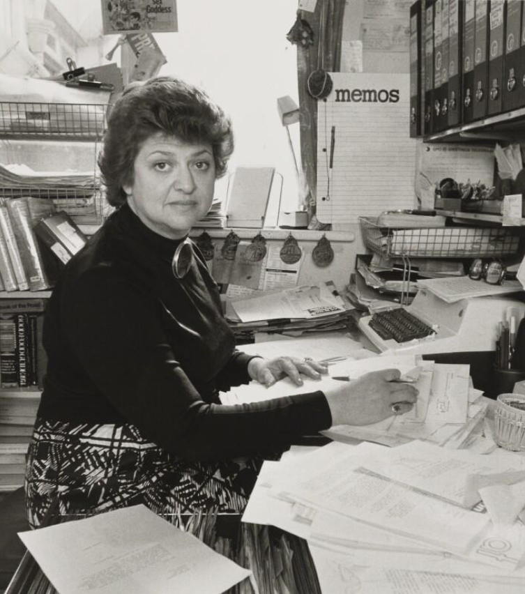 This is a photograph of a woman working. There were a lot of papers on her desk, and she was very unorganized. She looks tired based on her eyes. The lighting is natural, and the image is black and white to reflect her emotions. It also contrasts her black outfit against the white papers on her desk. The aperture is likely because the whole frame is in focus. Her posture is slightly slouchy, which is more indicative of the working class or someone who has been working for a long time. It is also likely a candid photo. The most interesting aspect of this photo is how her outfit pops out and the contrast between her dark outfit and the white papers and typewriter on the desk. The mood is serious and exhausted from working. The photo makes it look like she could be overworked.