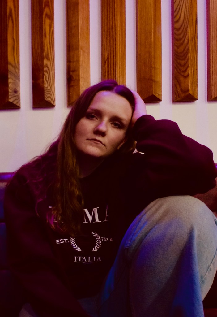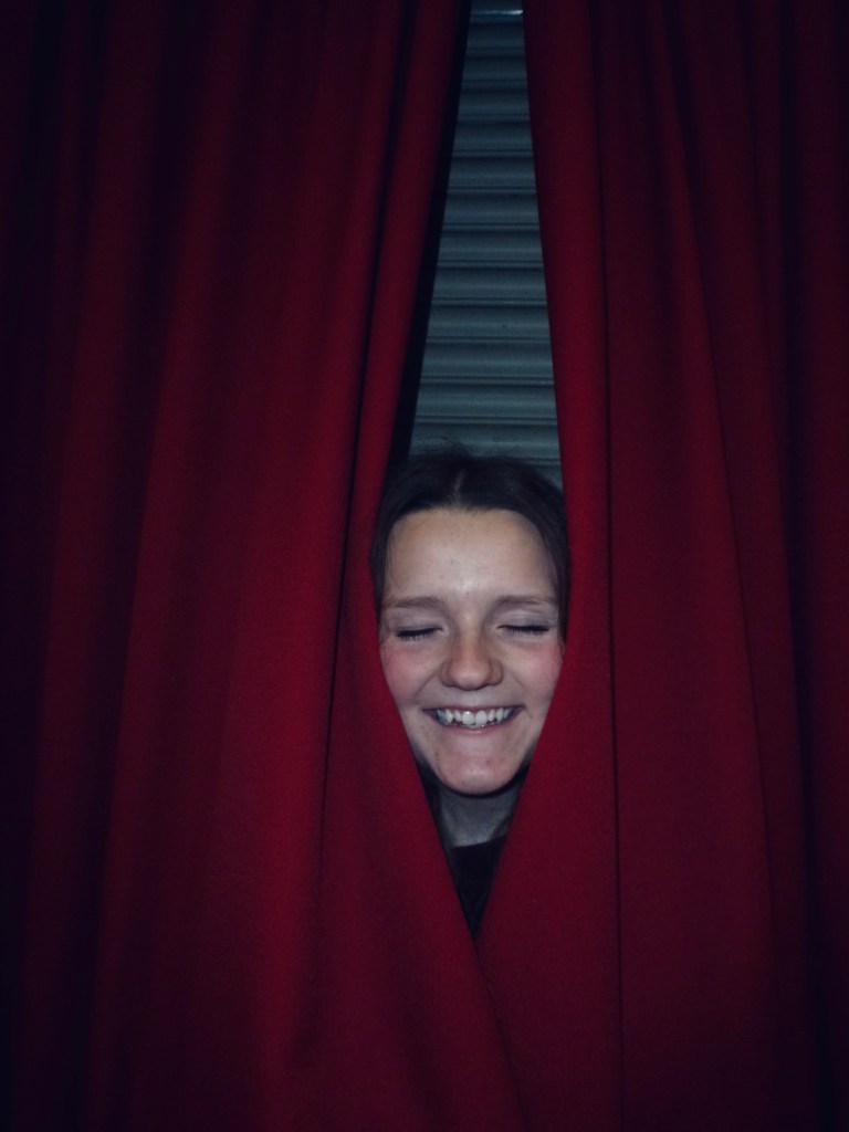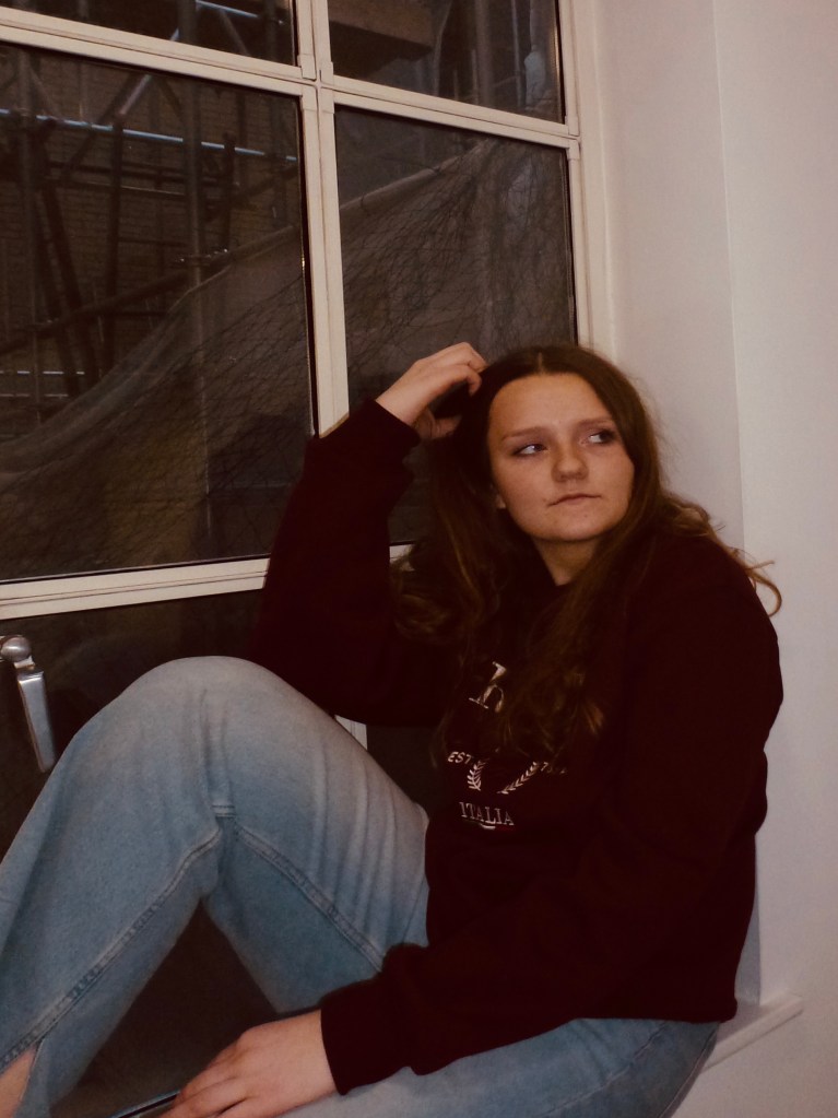 The three portraits, each telling a unique story, share a common emotional core. They transition between seriousness, happiness, and exhaustion; the first photo, for instance, has a serene and contemplative mood with the soft lighting and the slight reflection on the window creating a peaceful atmosphere, but the position and facial expression of the subject looking off in the distance adds a sense of introspection. Compared to the second image, her smile and the contrast with the dark red curtain create a joyful mood of happiness. Then, the third photo conveys a calm and introspective mood, emphasizing the lighting and her thoughtful and relaxed posture. All three portraits were captured using a LUMIX vintage camera with flash, contrasting the subject’s face and enhancing the emotional depth of the portraits. The interplay of red tones against a softly illuminated background produces cool and warm hues, capturing a fleeting moment reminiscent of the inspired black-and-white images.
